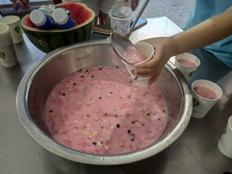 餐畢,后勤組的成員們早已備好驚喜——自制的西瓜椰椰飲品。冰爽的椰汁滑過喉嚨,帶著西瓜的清甜與椰果的Q彈嚼勁,一口下去暑氣全消,隊員們喝得眉眼彎彎,連連拍手叫好,幸福感在舌尖悄然蔓延。