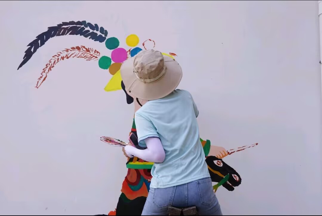 清晨五點的鬧鐘響起時,地面已經(jīng)發(fā)燙。團(tuán)隊成員采用"戰(zhàn)高溫作息表":清晨繪制主體輪廓,正午轉(zhuǎn)戰(zhàn)室內(nèi)整理皮影資料,傍晚繼續(xù)完善細(xì)節(jié)。顏料在高溫下快速凝結(jié),他們不得不反復(fù)調(diào)配;汗水滴在墻面上,就順勢化作皮影老藝人額頭的皺紋。