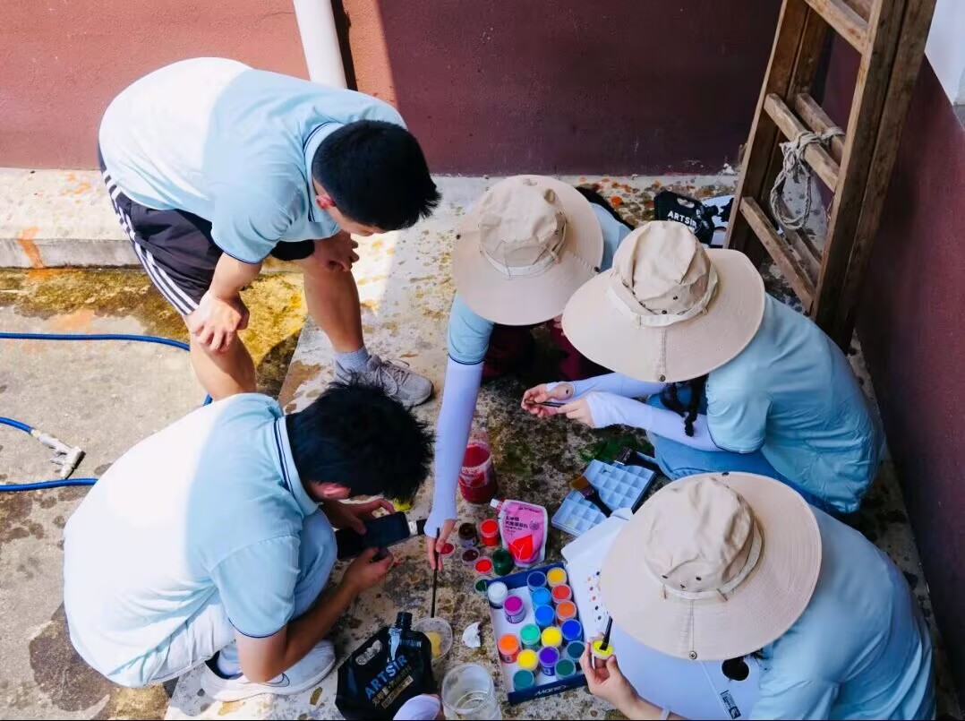(圖為團(tuán)隊成員烈日下坐高架梯繪制)