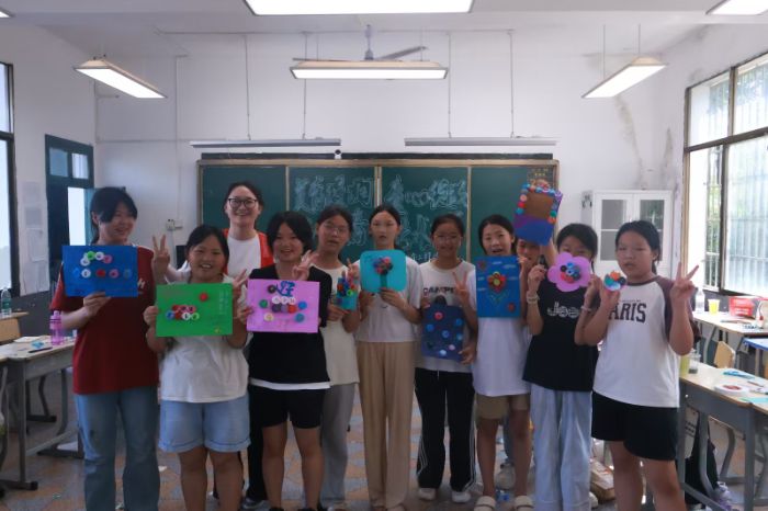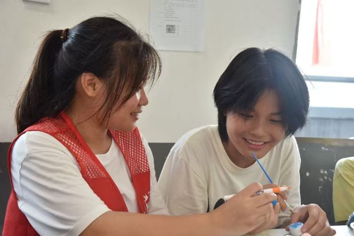 圖為實(shí)踐團(tuán)成員與山棗中學(xué)學(xué)生共同繪制創(chuàng)意瓶蓋。 王思璐攝