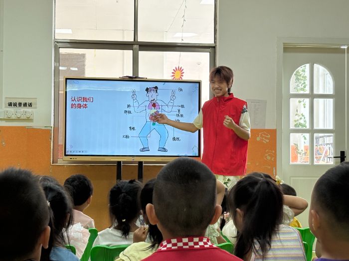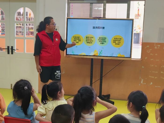 活動中,實踐團成員化身“安全小導(dǎo)師”,針對鄉(xiāng)村兒童常見的潛在風險,精心設(shè)計了一系列生動有趣的課程。實踐團成員巧妙運用趣味動畫、情景模擬等孩子喜聞樂見的形式,將防溺水、防性侵、交通安全等重要的安全知識融入簡單易懂的小故事中。志愿者們?yōu)楫數(shù)貎和行ёR別危險、預(yù)防意外筑牢了知識屏障。