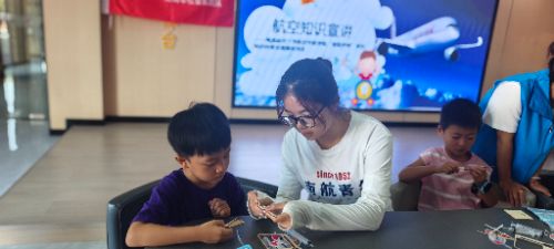 (圖13)實(shí)踐隊(duì)員在進(jìn)行航空知識(shí)科普 (圖14)實(shí)踐隊(duì)員在教小朋友們做航模