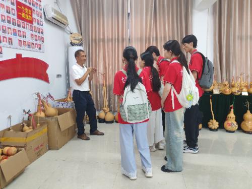在傳承人顧秀國(guó)的工作室和展覽室中,隊(duì)員們觀察到葫蘆烙畫上的內(nèi)容不僅有傳統(tǒng)的花鳥魚蟲,還有新潮的動(dòng)畫人物,比如電影《魔童降世》中的哪吒,還有近期火爆的玩偶labubu。傳承人顧秀國(guó)表示,葫蘆烙畫的內(nèi)容在傳承古畫的同時(shí),也會(huì)實(shí)時(shí)關(guān)注社會(huì)動(dòng)向與需求,為購買者提供個(gè)人定制服務(wù),讓非遺技藝在傳承的基礎(chǔ)上更好的與社會(huì)融合。葫蘆烙畫的形式也是多種多樣的。既有純葫蘆烙畫,也有彩色畫,雕刻畫,還有精美的掐絲工藝,漆面葫蘆畫。在介紹展覽室里的葫蘆烙畫作品時(shí),大家觀察到有幾個(gè)大葫蘆形狀“崎嶇”,有一個(gè)葫蘆柄上自然的打著一個(gè)結(jié),或者兩個(gè)葫蘆一起打結(jié),甚至還有三個(gè)一起的。傳承人顧秀國(guó)解釋道,這些特殊的葫蘆形狀是在葫蘆小的時(shí)候人為塑形的。他還分享了一個(gè)要去的知識(shí),葫蘆塑型一定要在下午,下午時(shí)葫蘆是軟的,才方便塑形,但如果是上午,那是葫蘆是脆的,一掰就斷了。說到這些細(xì)節(jié)時(shí),傳承人顧秀國(guó)口若懸河,對(duì)制作葫蘆烙畫的過程如數(shù)家珍,神采奕奕的向大家介紹,時(shí)不時(shí)望向窗外的葫蘆地,眼神中滿滿是對(duì)葫蘆的驕傲。