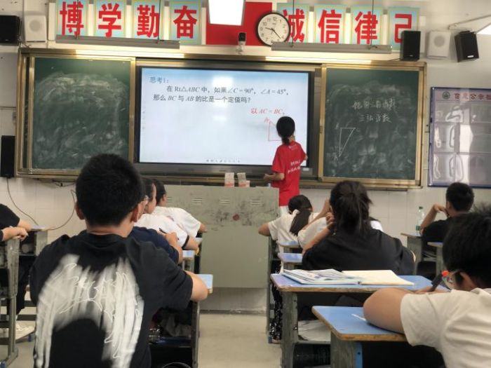 “比薩斜塔高54.5米,塔頂偏移5.2米,如何求傾斜角α?”課程伊始,唐單倩用生動的圖文引發(fā)學生思考。她引導學生將實際問題轉化為數(shù)學模型:構建直角三角形ABC,從已知直角邊BC與斜邊AB的關系中,提煉出“銳角正弦值等于對邊與斜邊之比”的核心定義。隨后,山坡灌溉的案例進一步強化應用——通過30°坡角和對邊長度,反向推導所需水管長度。這種“從生活中來,到數(shù)學中去”的設計,讓晦澀的公式變得直觀可感。