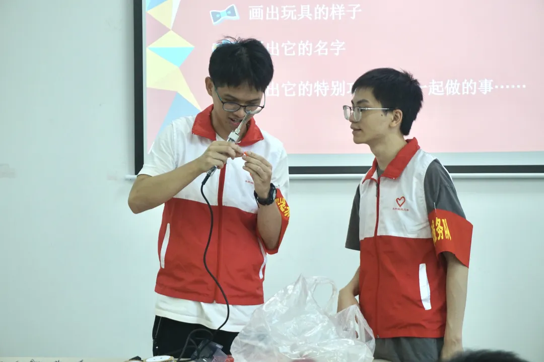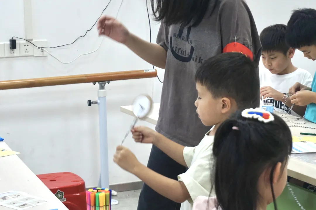 為積極落實“百千萬工程”,豐富社區(qū)兒童的暑假生活、助力社區(qū)兒童身心健康發(fā)展,2025年7月15日,華南師范大學物理學院四進永和服務隊隊員鄭點走進廣州市黃埔區(qū)永和社工服務站,為小朋友們帶來富有童心童趣的“玩具總動員之拉線飛輪”活動課。