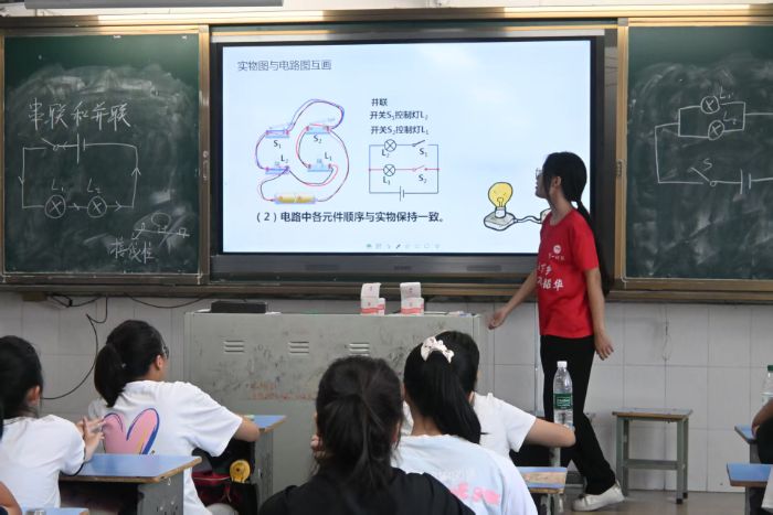 "為什么節(jié)日彩燈熄滅一串,整條燈鏈就陷入黑暗?而教室的日光燈管壞了,其他燈管卻依然明亮?" 隨著夏坤榮老師拋出這個生活謎題,物理課堂瞬間點燃了思維的火花。在鄧婕、鄒燁、張煦涵老師以及唐單倩、向素妍老師的共同見證下,一場關(guān)于電路連接本質(zhì)的探索之旅在電流的脈動中拉開序幕。