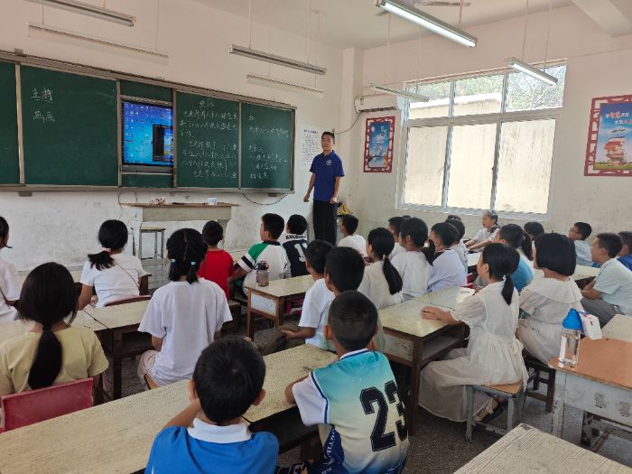 支教的日子里,團(tuán)隊(duì)成員們結(jié)合今年的特色課程,讓課堂煥發(fā)著不一樣的活力。把節(jié)奏與韻律藏進(jìn)快板課,孩子們跟著節(jié)拍學(xué)說普通話,字句間滿是靈動(dòng);蠟筆畫課上,五彩斑斕的畫筆在紙上飛舞,孩子們用色彩搭配著普通話描述自己的想法;朗誦課里,詩詞的韻味與標(biāo)準(zhǔn)發(fā)音碰撞出獨(dú)特的火花;主持課上,孩子們學(xué)著掌控全場(chǎng)的姿態(tài),用清晰的表達(dá)傳遞觀點(diǎn);演講課中,他們大膽訴說心中所想,自信在一次次開口中悄然生長(zhǎng);國(guó)際學(xué)課程帶他們窺見世界的多元,手工課讓指尖的創(chuàng)造與語言描述相輔相成;舞蹈課上的肢體律動(dòng)與音樂課的旋律哼唱,都成了普通話練習(xí)的獨(dú)特載體;愛國(guó)教育課上,紅色故事在標(biāo)準(zhǔn)的發(fā)音中更顯動(dòng)人;讀書會(huì)里,孩子們分享著書中的世界,讓語言成為思想交流的橋梁……每當(dāng)看到孩子們用普通話流利地完成一段快板、清晰地介紹自己的蠟筆畫,或是在課堂上自信表達(dá)時(shí),我們心中的成就感便油然而生。