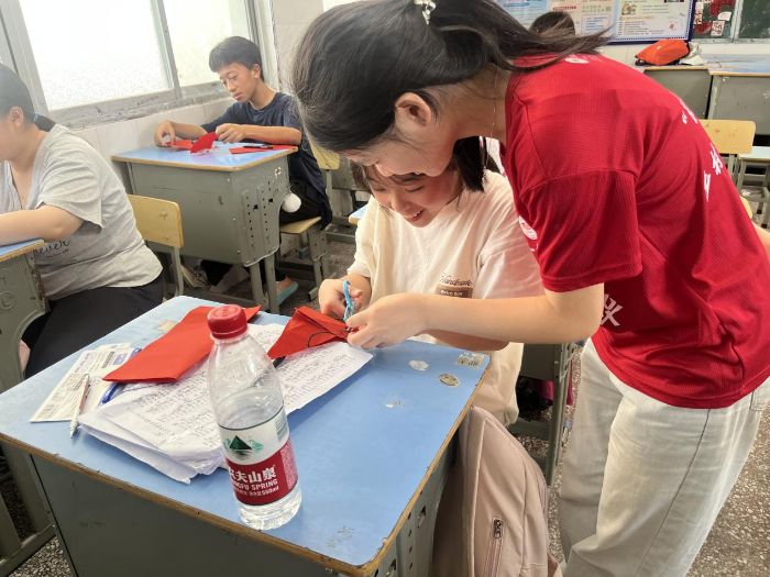 實踐環(huán)節(jié)成為課堂的高潮。兩位老師分工指導(dǎo):鄒燁老師示范五角星、六角星的折疊剪法,強調(diào)“36度角對折”“沿斜線剪裁”的關(guān)鍵步驟;張煦涵老師則手把手教大家剪制團花與蝴蝶,從正方形紙的四次對折,到柳葉紋、桃形孔的鏤空技巧,耐心糾正學(xué)生們的運剪角度。