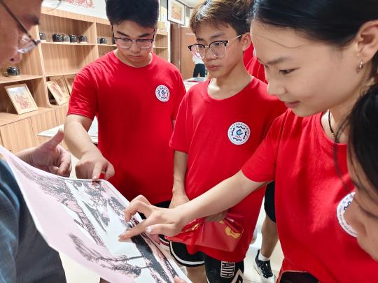 03 隨后,邂逅山花剪紙藝術(shù)。非遺傳承人示范剪、刻、染技法,隊(duì)員們專注學(xué)習(xí),紅紙?jiān)谥讣饣黛`動(dòng)圖案,體悟傳統(tǒng)技藝的精巧。