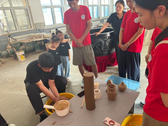 02 隨后志愿者團(tuán)隊(duì)開啟非遺深度體驗(yàn)之旅。先是投身于黑陶制作,觸摸細(xì)膩陶土,在匠人指導(dǎo)下嘗試?yán)鳌⒌窨蹋惺芎谔?ldquo;薄如紙、亮如漆”的獨(dú)特質(zhì)感,于泥土蛻變中,探尋非遺文化的厚重底蘊(yùn),堅(jiān)定傳承創(chuàng)新的使命。