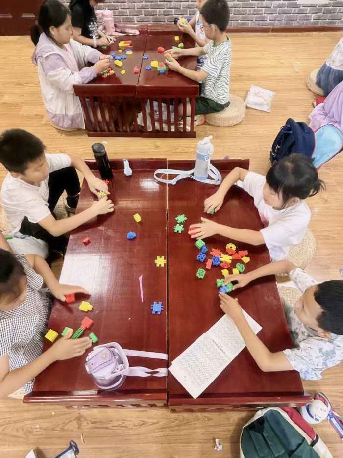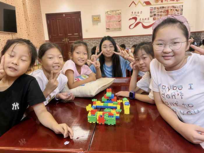 積木創(chuàng)意拼接環(huán)節(jié)則為孩子們的想象力提供了更廣闊的空間。實(shí)踐團(tuán)不設(shè)固定主題,引導(dǎo)孩子們自由發(fā)揮,小小的積木塊在孩子們手中變成了飛機(jī)、城堡、宇宙飛船等各式作品,協(xié)作的樂(lè)趣與創(chuàng)新的火花在互動(dòng)中持續(xù)迸發(fā)。