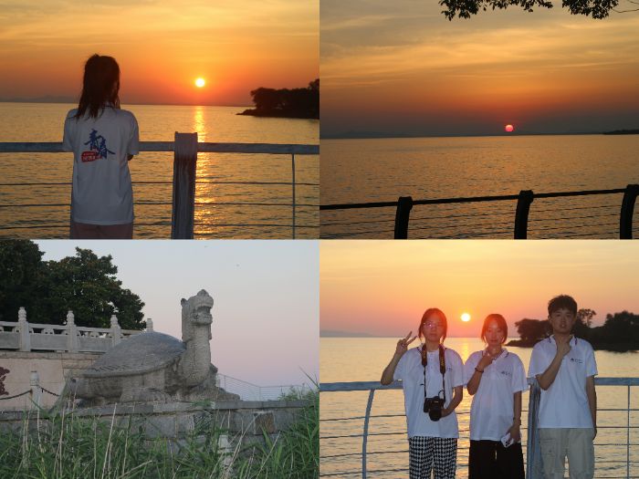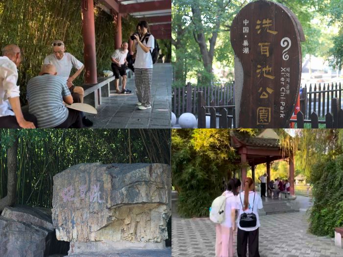 巢湖洗耳池公園承載“許由洗耳”典故。傳說堯帝欲禪位于許由,許由堅辭不受,因嫌此言污耳,遂于池邊洗耳。如今,公園以典故為魂,成為展現地方文化底蘊的重要窗口。實踐團成員踏入園內,深度挖掘園區(qū)文化內涵。波光粼粼的洗耳池畔,垂柳拂水、錦鯉游弋,遠處石桌旁老人們對弈的吆喝聲,勾勒出一幅動靜相宜的生活圖景。團隊成員沿棧道前行,駐足于“洗心橋”——這座相傳為古時文人臨水自省的古橋,木質欄桿被歲月打磨得溫潤光滑,仿佛訴說著歷代文人墨客在此滌蕩心境的故事。團隊成員用鏡頭記錄下飛檐翹角、光影斑駁的園林之美,為后續(xù)文化宣傳積累生動素材。游覽過程中,成員們不僅領略了公園的優(yōu)美風光,更深刻感受到了傳統(tǒng)文化的獨特魅力。