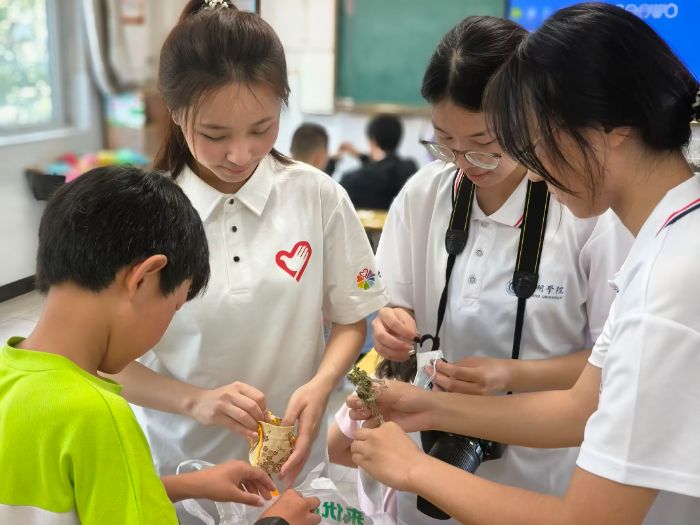 首先,鄧抒揚(yáng)以通俗易懂的中醫(yī)小故事開篇,向小朋友詳細(xì)介紹中醫(yī)藥的興起、運(yùn)用及其歷代傳承與發(fā)展。接著,鄧抒揚(yáng)帶領(lǐng)小朋友們學(xué)習(xí)《中醫(yī)謠》。她通過一些生動(dòng)有趣的中醫(yī)小知識(shí)引出朗朗上口的《中醫(yī)謠》“陰陽五行明,臟腑經(jīng)絡(luò)精,理法方藥多變通,精髓在其中。”鄧抒揚(yáng)耐心地向小朋友們解釋詞中含義,帶領(lǐng)小朋友們一起朗誦并觀看其視頻。隨后,鄧抒揚(yáng)通過精心設(shè)計(jì)的中醫(yī)趣味小課堂對(duì)本次中醫(yī)文化宣傳活動(dòng)進(jìn)行總結(jié)。她以貼近生活的夏季健康為主題,向小朋友們深入淺出地講解了中醫(yī)防治中暑的刮痧方法、清涼解暑的食療方劑,以及天然驅(qū)蚊的草藥妙用等實(shí)用知識(shí)。通過這種寓教于樂的互動(dòng)教學(xué),不僅讓孩子們掌握了實(shí)用的生活技能,更通過日常生活的點(diǎn)滴細(xì)節(jié),潛移默化地激發(fā)了他們對(duì)中醫(yī)藥文化的濃厚興趣。最后,實(shí)踐團(tuán)的成員以寓教于樂的方式,帶領(lǐng)小朋友們沉浸式體驗(yàn)中醫(yī)藥文化魅力。成員們耐心指導(dǎo)孩子們完成中醫(yī)藥草拼圖并制作艾草香囊,讓傳統(tǒng)中醫(yī)藥文化在一針一線間傳承延續(xù)。