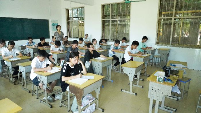 支教團(tuán)成員盧子浩向?qū)W生講解英語(yǔ)句子