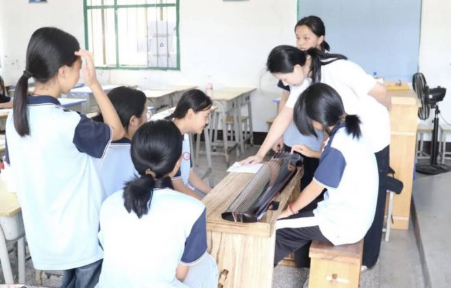 弦歌古韻,詩樂相融實(shí)踐隊(duì)員曾王渝、翁幸婷依托“唱經(jīng)典”課程將古琴弦歌帶進(jìn)校園,帶領(lǐng)學(xué)生感受傳統(tǒng)文化的雅致與浪漫。隊(duì)員曾王渝先以“區(qū)別古琴與古箏”的趣味活動(dòng)為課程導(dǎo)入,詳細(xì)介紹并展示了古琴。翁幸婷則重點(diǎn)講解了《詩經(jīng)·桃夭》的字詞與思想內(nèi)涵,以《詩經(jīng)·桃夭》為范本用古琴彈奏其古樸旋律。在課堂中,學(xué)生們逐句學(xué)唱“桃之夭夭,灼灼其華”,理解詩句中對(duì)美好生活的贊頌。學(xué)生們在課后感嘆道,原來古詩可以這么美。
