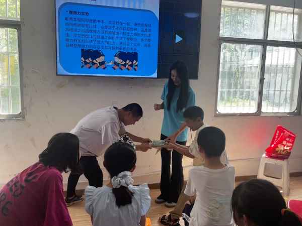 下午,實(shí)踐團(tuán)隊(duì)開(kāi)展了科學(xué)主題教育課。團(tuán)隊(duì)隊(duì)員運(yùn)用精心籌備的課件、踴躍的問(wèn)答環(huán)節(jié)、精彩的動(dòng)畫(huà)演示以及有趣的科學(xué)小實(shí)驗(yàn),深入淺出地為孩子們普及科學(xué)知識(shí)。在做摩擦力書(shū)本實(shí)驗(yàn)時(shí),珊珊好奇地問(wèn):“老師,為什么把兩本書(shū)的書(shū)頁(yè)交叉在一起就很難拉開(kāi)呀?”隊(duì)員耐心地解釋著原理。講解過(guò)程中,孩子們被一個(gè)個(gè)奇妙的科學(xué)現(xiàn)象所吸引,積極踴躍地回答問(wèn)題,與實(shí)踐隊(duì)員互動(dòng)頻繁。“我知道了,這就是摩擦力的作用!”儲(chǔ)夢(mèng)怡大聲說(shuō)道。這種寓教于樂(lè)的方式,讓孩子們?cè)谳p松愉悅的氛圍中領(lǐng)略到科學(xué)的魅力,激發(fā)了他們對(duì)科學(xué)知識(shí)的濃厚興趣。