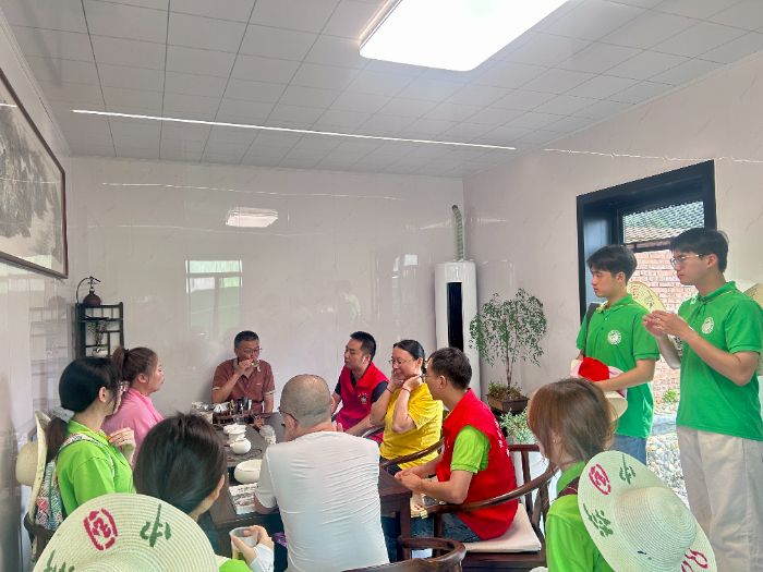 在輕松愉快的氛圍中,實(shí)踐隊(duì)與帶隊(duì)老師、基地負(fù)責(zé)人圍坐品茗,手捧清香的茯苓茶,就茯苓產(chǎn)業(yè)的種植技術(shù)、市場(chǎng)前景及產(chǎn)業(yè)升級(jí)展開(kāi)了深入交流。這種寓交流于品茗的互動(dòng)形式,不僅讓討論更加生動(dòng)活潑,也讓隊(duì)員們對(duì)茯苓產(chǎn)業(yè)有了更直觀立體的認(rèn)識(shí)。