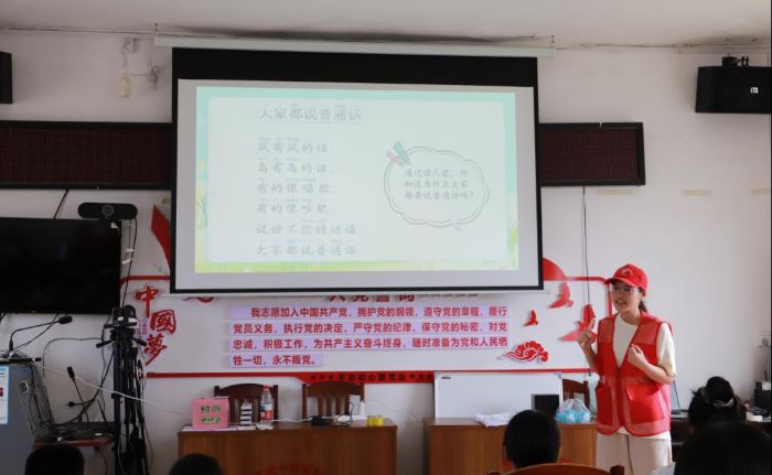 實(shí)踐團(tuán)秉持“趣味學(xué)習(xí)、實(shí)用提升”原則,為天寶村學(xué)前兒童及中小學(xué)生量身定制多元化課程。在語言文化課堂中,實(shí)踐隊(duì)員首先播放視頻《一起來說普通話》,用動(dòng)畫演示“方言隔座山、普通話連心橋”的生動(dòng)故事,讓孩子們直觀感受普通話在人際溝通中的橋梁作用。隨后實(shí)踐隊(duì)員和學(xué)生一起用普通話朗讀兒歌《大家都說普通話》,再由當(dāng)?shù)貙W(xué)生用當(dāng)?shù)胤窖怨鹆捄拓锢姓Z嘗試?yán)首x兒歌,現(xiàn)場(chǎng)笑聲此起彼伏,語言的多元魅力悄然生根。實(shí)踐隊(duì)員通過帶同學(xué)們觀看視頻了解我國(guó)通用語言的歷史,讓同學(xué)們了解到中國(guó)最早的通用語言是雅言,現(xiàn)代的通用語言是普通話。實(shí)踐隊(duì)員向?qū)W生們強(qiáng)調(diào)普通話和方言不沖突,普通話就像一種“通用密碼”,使用普通話使人們溝通更便利。