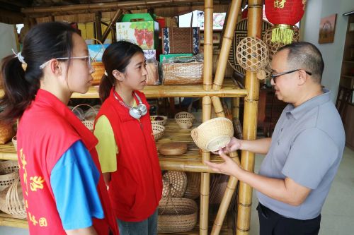 隨后,調(diào)研重心移至綏寧縣非遺文化展示中心。該中心集中呈現(xiàn)了綏寧豐富的非遺文化,竹編技藝尤為突出。在這里,實(shí)踐團(tuán)成員詳細(xì)了解了竹編的歷史、工藝及市場應(yīng)用,并與肖煒樺就發(fā)展難題進(jìn)行深入探討。