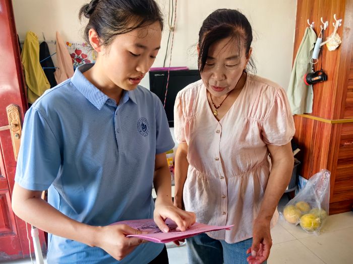 圖為實(shí)踐服務(wù)隊(duì)入戶為村民宣講。姬皓真供圖
