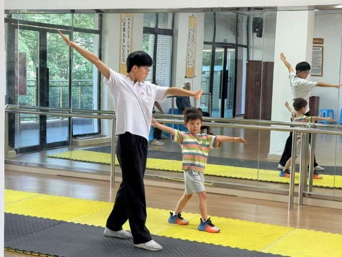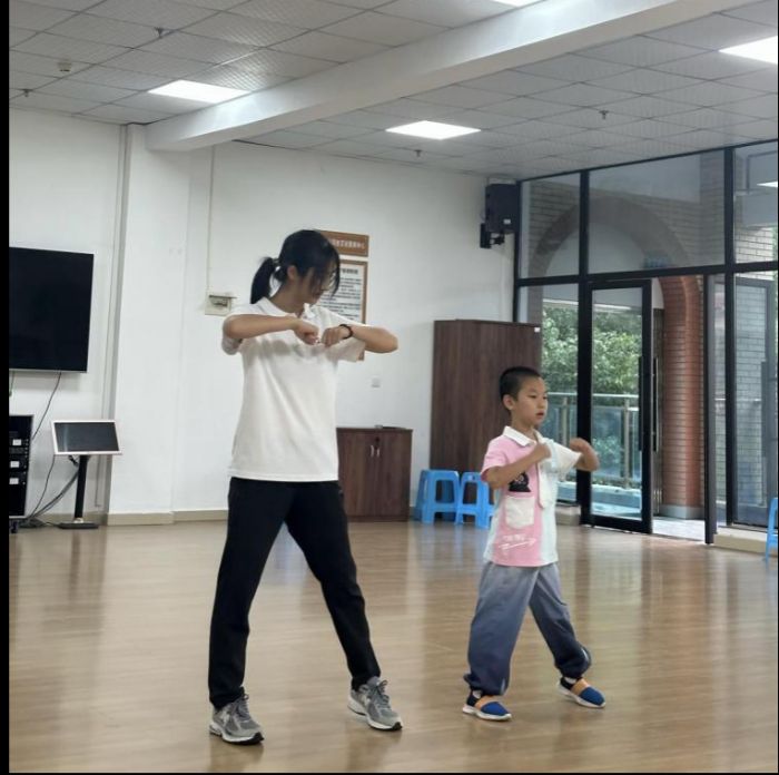 以五步拳為基礎(chǔ),結(jié)合單拍腳、仆步掄拍、掄臂砸拳等組合動(dòng)作,團(tuán)隊(duì)成員從抱拳禮開始,逐步教授武術(shù)的攻防節(jié)奏。孩子們從動(dòng)作僵硬到流暢有力,眼神從羞澀躲閃到堅(jiān)定自信,武術(shù)不僅鍛煉了他們的身體協(xié)調(diào)性,更磨礪了堅(jiān)持到底的毅力。