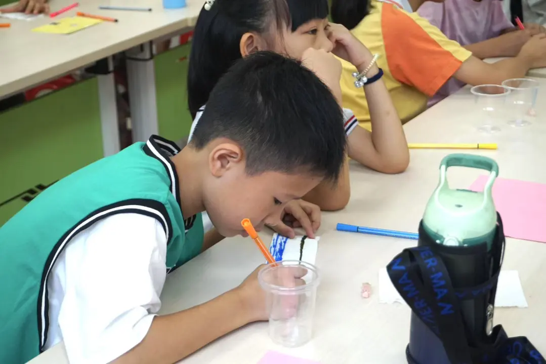 通過一系列學(xué)習(xí)后,小朋友們已經(jīng)對(duì)光的色散有了初步認(rèn)識(shí)。授課老師給他們播放了一個(gè)有趣的動(dòng)畫視頻,并還向小朋友們介紹光的三原色——紅、綠、藍(lán),用這三種顏色的光可以混合出其他顏色的光,如紅光和綠光混合后形成黃光,當(dāng)三種顏色的光混合后就形成了白光。小朋友們對(duì)于這一個(gè)現(xiàn)象覺得很不可思議。課程最后一個(gè)環(huán)節(jié),授課老師讓小朋友們?cè)诩埥砩袭嫵霾屎绲念伾瑢⒓埥淼囊徊糠址湃胨泻螅埥砩系纳示蛿U(kuò)散,形成彩虹搭橋,對(duì)于這一個(gè)小手工小朋友們都非常感興趣,紛紛進(jìn)入彩虹手工小世界。