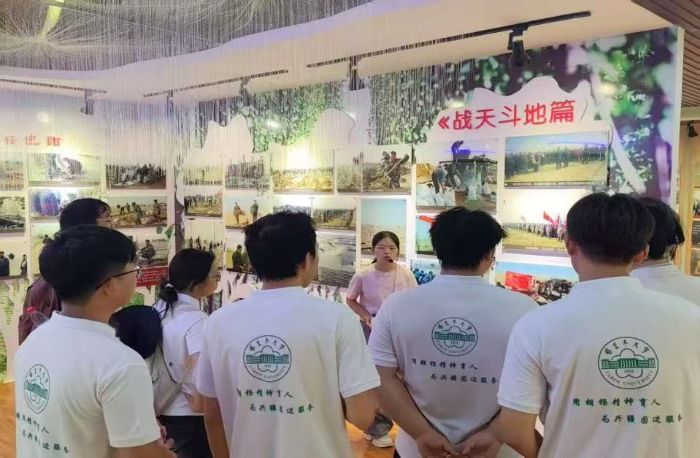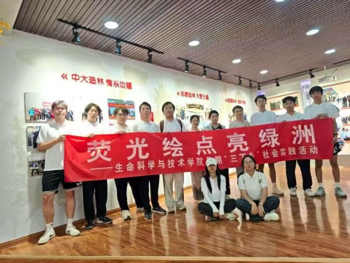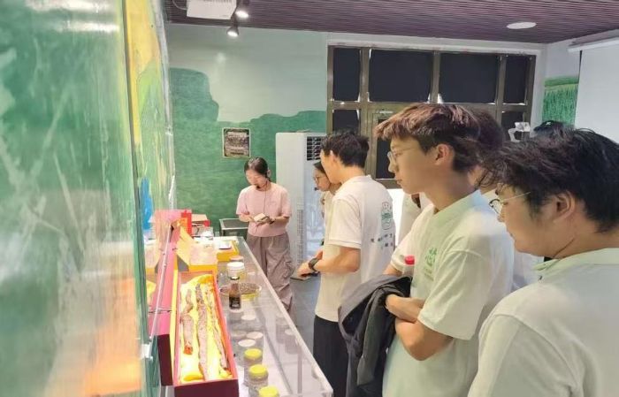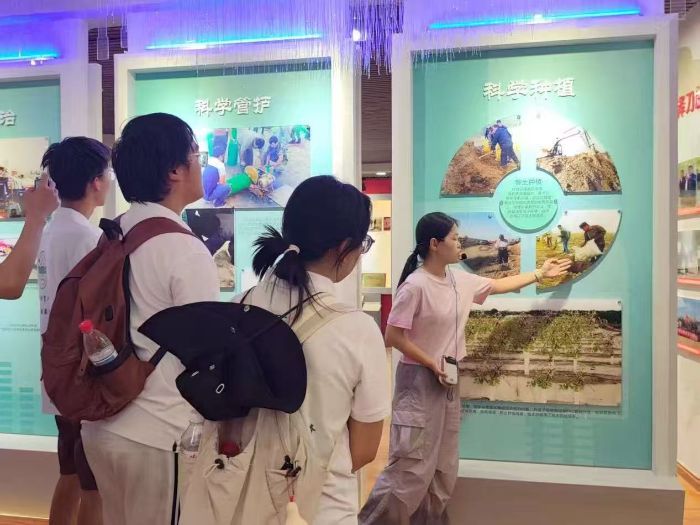 隨后,實踐團走進麥蓋提縣生態(tài)林展示館,在防沙治沙中心干部王姣姣的細致講解下,系統(tǒng)學習當?shù)氐闹紊臣夹g(shù)體系與產(chǎn)業(yè)發(fā)展模式。在“生態(tài)林鎖邊”“工程治沙”等展區(qū),隊員們通過豐富的展板展示,深入了解到治沙人運用網(wǎng)格固沙、飛播造林、節(jié)水灌溉等科學手段,實現(xiàn)流沙固定、植被恢復(fù)的技術(shù)路徑,對治沙技術(shù)的不斷創(chuàng)新與發(fā)展表示由衷的贊嘆。在梭梭、肉蓯蓉等沙生植物培育區(qū),實踐團成員們探究了沙生植物從適應(yīng)沙漠環(huán)境的自然育種,經(jīng)過人工選育、技術(shù)賦能,轉(zhuǎn)化為兼具生態(tài)固沙功能與經(jīng)濟開發(fā)價值資源的全過程,深刻認識到科技在治沙工作中的重要作用。