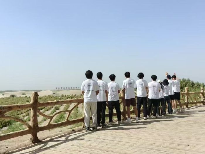 實踐團抵達麥蓋提縣后,在當?shù)靥峁┑膶S媒煌ūU舷虑巴死敻缮衬吘売^測點。在這里,實踐團看到曾經(jīng)飽受流沙侵蝕、嚴重威脅周邊生產(chǎn)生活空間的區(qū)域,經(jīng)過長期治沙工程的持續(xù)推進,如今已構(gòu)建起多層固沙林帶,展現(xiàn)出 “林進沙退” 的顯著成效,讓隊員們直觀感受到治沙工程的偉大力量。