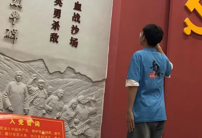 行至烈士事跡陳列廳,墻上 “抗日救亡,血戰(zhàn)沙場”“抗美援朝,英勇殺敵” 等字樣蒼勁有力,訴說著英烈們的壯舉。實踐團的團員與入黨積極分子列隊肅立,凝視著這些文字,心中涌起對先烈的崇敬之情。不遠處的入黨誓詞墻前,大家亦駐足凝望,莊嚴肅穆的氛圍中,先輩們的精神與青年學子投身鄉(xiāng)村振興的熱忱相互交融。