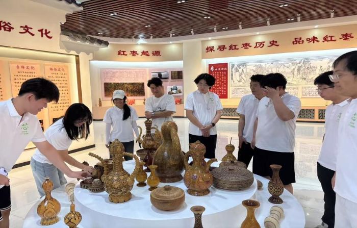 7月8日,實踐團繼續(xù)前行,走進麥蓋提紅棗產(chǎn)業(yè)研究院,通過實地參觀、實踐操作與訪談交流等多種形式,深入挖掘沙漠邊緣特色農(nóng)業(yè)與生態(tài)協(xié)同發(fā)展的有效模式。當(dāng)日,在研究院開熱木拉·阿布都艾尼老師的帶領(lǐng)下,實踐團開啟了參觀之旅。活動開始時,老師熱木拉·阿布都艾尼播放了宣傳片,介紹麥蓋提紅棗產(chǎn)業(yè)的發(fā)展和品牌價值。接著,他詳細(xì)講解了中國棗種植分布和新疆名棗的優(yōu)勢,強調(diào)了新疆紅棗的卓越地位。在文化展示環(huán)節(jié),他深入講解了紅棗在新疆文化中的重要性,并展示了古代盛放棗的器皿,顯示了棗文化的深厚底蘊。在大田實踐環(huán)節(jié),成員們參與了棗樹的農(nóng)事操作,體驗了科學(xué)種植對提升紅棗品質(zhì)和產(chǎn)量的重要性。