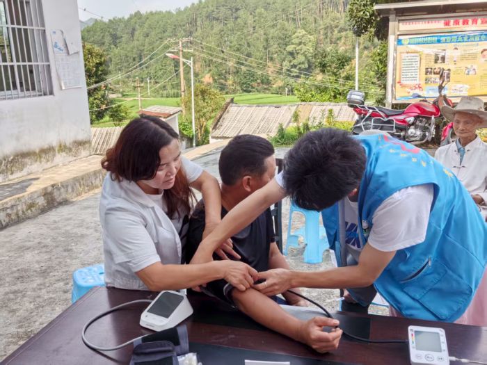 圖為實踐團成員在為老人們測量血壓血壓。毛藝霖 供圖