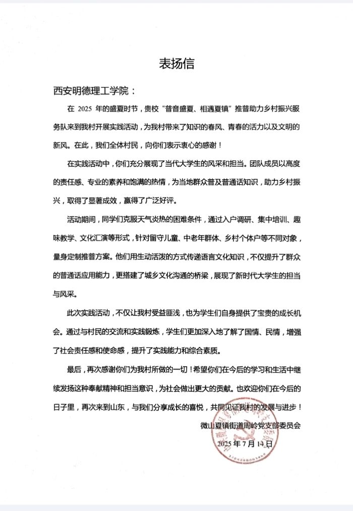 2025年盛夏,西安明德理工學(xué)院"普音盛夏·相遇夏鎮(zhèn)"推普助力鄉(xiāng)村振興服務(wù)隊(duì)深入微山夏鎮(zhèn),以"分層教學(xué)+多元形式"的創(chuàng)新模式開展普通話推廣活動,獲當(dāng)?shù)厝罕姀V泛好評。夏鎮(zhèn)全體村民近日向?qū)W院寄送表揚(yáng)信,高度評價(jià)服務(wù)隊(duì)"用專業(yè)素養(yǎng)搭建城鄉(xiāng)文化橋梁,以青春擔(dān)當(dāng)助力鄉(xiāng)村振興"。