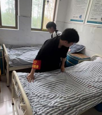實踐隊成員鄧云芳和鐘艷文在藥房細致核查,確保每位老人的體檢單準確無誤。溫強健、張翔、符豐三位同學(xué)則在辦公室和輸液室進行衛(wèi)生打掃和病床整理工作,為前來就醫(yī)的老人創(chuàng)造一個整潔、舒適的環(huán)境,用實際行動傳遞溫暖和關(guān)懷。