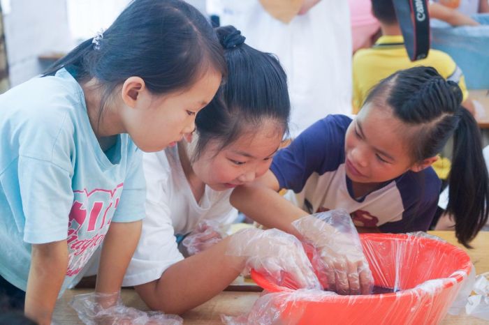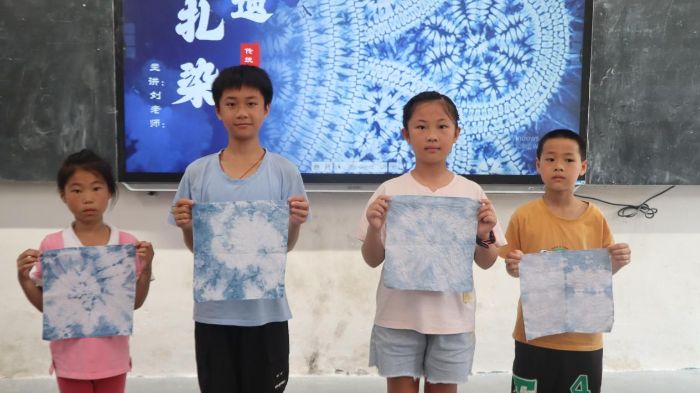 實踐環(huán)節(jié),支教組提供標(biāo)準(zhǔn)化材料(純棉白布、藍(lán)靛染料、皮筋、塑料盆等),學(xué)生按步驟操作:先將棉布充分浸濕,再根據(jù)設(shè)計需求進(jìn)行折疊、纏繞、捆扎,隨后浸入染料靜置規(guī)定時長,最后拆去捆扎物完成作品。