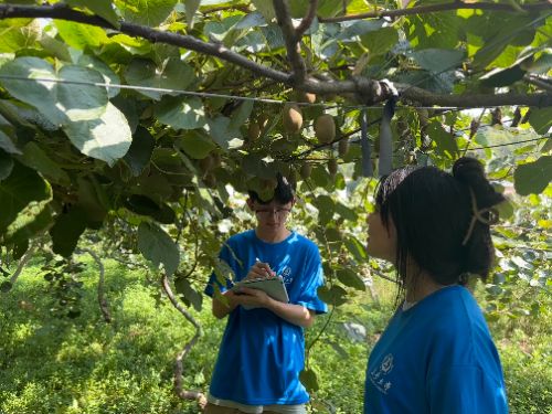 隨后,實踐隊隊員深入果園內(nèi)部開展調(diào)研與討論。在縱橫交錯的獼猴桃藤下,隊員們觀察并記錄了當前階段獼猴桃的生長狀況。通過對比所記錄的各項指標,隊員們不僅直觀地了解到不同果品的精細化管理差異,更深刻體會到基地工作人員應(yīng)對市場、順應(yīng)自然的智慧與辛勞。大家表示,這不僅是“看果”,更是向扎根土地、向上生長的勞動者學習,切身感受鄉(xiāng)村振興的厚重責任。