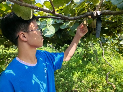 科技賦能產(chǎn)業(yè),創(chuàng)新盤活資源。在調(diào)研過程中,實踐隊中有人問到藤架上的球形物,周學良解釋道這是用于誘蠅的生物技術(shù)。與此同時,他還創(chuàng)造性地運用了生存能力強悍的水楊進行嫁接栽培,讓獼猴桃們也能體驗“架空感”。實踐隊員們切實體會到科技的力量足以打破空間與時間的壁壘,創(chuàng)新能讓人大膽突破、敢想敢做。