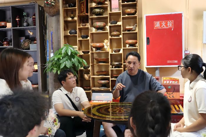 在老師的指導(dǎo)下,團(tuán)隊(duì)成員嘗試?yán)L制簡(jiǎn)單的彝族紋樣。初次握筆的手難免顫抖,線條歪歪扭扭,但大家都學(xué)得格外認(rèn)真。當(dāng)看到自己筆下的羊角紋、火塘紋逐漸在漆盤上成形,龔曦赟感慨道:“原來一件小小的漆器,背后是這么多道工序和這么深的文化密碼。這不僅是手藝,更是彝族人民一代代傳下來的精神財(cái)富。”