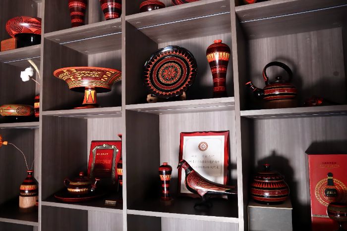 “一器一漆,皆有故事。”實(shí)踐團(tuán)成員一踏入基地,便被陳列架上琳瑯滿目的漆器所震撼。濃郁如火的朱砂紅、明亮如金的明黃、深邃如夜的黑,交織碰撞于一件件器皿之上。或?yàn)榫凭呤称鳎驗(yàn)榧漓攵Y器,其紋樣古樸神秘,造型敦厚大方,散發(fā)著濃郁的民族氣息和厚重的歷史感。
