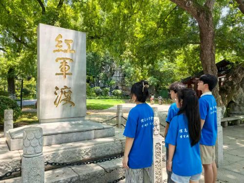 當(dāng)日下午,實踐隊來到紅軍渡廣場。古銀杏樹下,紅軍渡石碑前,全體團(tuán)員身戴團(tuán)徽,莊嚴(yán)肅立,表達(dá)積極向黨組織靠攏和為共產(chǎn)主義事業(yè)奮斗終身的堅定決心。通過重走紅軍在湖跡渡的革命足跡,全體隊員感悟到革命先輩們?yōu)榱嗣褡褰夥攀聵I(yè),不惜拋頭顱、灑熱血的堅定信念和偉大精神。