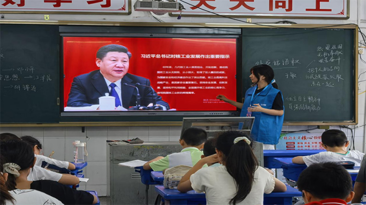 時(shí)光為經(jīng),精神為緯。主講老師梁曦月播放中國(guó)核工業(yè)歷史影像,并展示算盤模型。屏幕上,1964年羅布泊上空升起的蘑菇云,將那段“紙筆+算盤”鑄就的科研傳奇生動(dòng)再現(xiàn)。從用算盤計(jì)算核數(shù)據(jù)的艱苦歲月,到自主設(shè)計(jì)“華龍一號(hào)”的輝煌成就,中國(guó)核工業(yè)的奮斗史在孩子們面前徐徐展開(kāi)。“華龍一號(hào)”第三代核電技術(shù)模型的展現(xiàn),向孩子們生動(dòng)詮釋了新時(shí)代中國(guó)核工業(yè)從技術(shù)引進(jìn)到自主創(chuàng)新、從跟跑到領(lǐng)跑的歷史性跨越。