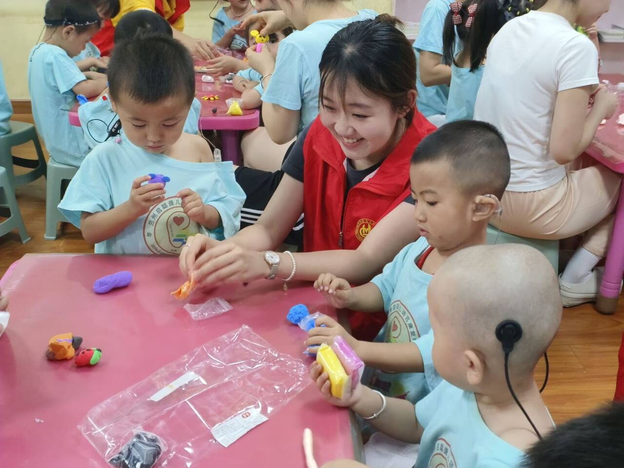實踐隊員們身著統(tǒng)一志愿服裝,懷揣著熱忱與期待開啟此次公益之行。在特殊學(xué)校,聽障兒童們的世界雖寂靜無聲,卻滿是對美好事物的向往;顒又,實踐隊員配合中心老師,與孩子們共同開展橡皮泥泥塑創(chuàng)作。