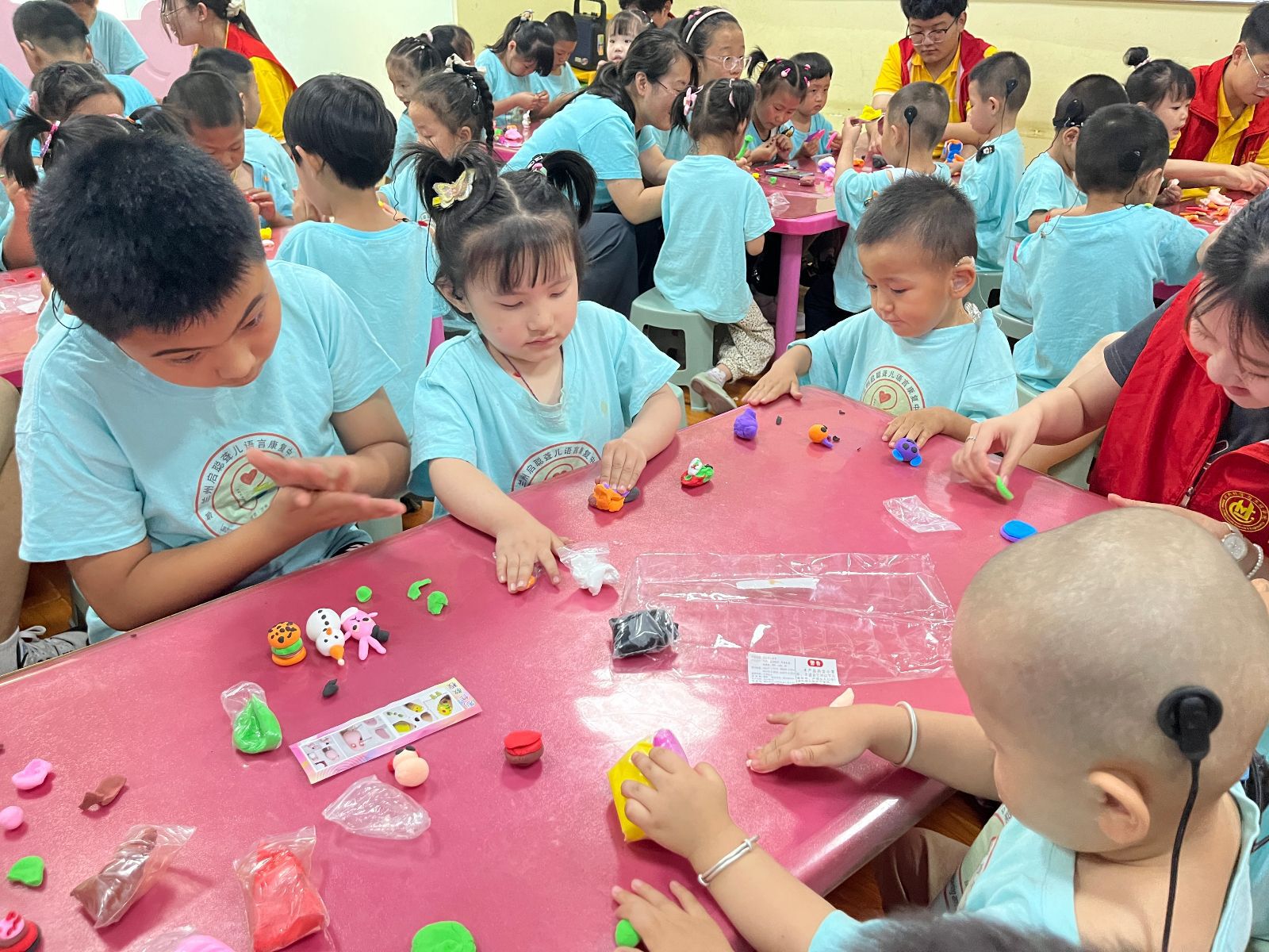 面對聽力障礙帶來的溝通阻礙,隊員們耐心十足,通過手勢、文字、表情,一點點與孩子建立連接,引導(dǎo)他們發(fā)揮想象,用色彩斑斕的橡皮泥捏出造型各異的作品。從簡單的花朵、動物,到充滿童趣的童話場景,每一次創(chuàng)作,都是心與心的靠近。孩子們專注投入,在隊員幫助下將想象化為有形,臉上綻放的笑容,成為志愿活動最美的注腳。面對孩子,實踐隊友放慢動作,先用手輕輕比劃,又在紙上畫出簡單圖案,耐心引導(dǎo)孩子理解創(chuàng)作想法。黏土在掌心揉捻,從粗糙到細(xì)膩,隊員和孩子的手一起,將彩色泥團(tuán)塑成花朵、小動物,或是奇奇怪怪的“小世界” 。孩子偶爾因手法不熟皺眉,隊員就笑著握住小手,一點點調(diào)整,活動室里,沒有太多話語,卻滿是專注與默契,那些慢慢成型的泥塑,成了無聲交流里最生動的成果,見證著青春善意與童真的相遇,把愛揉進(jìn)了每一抹色彩里。