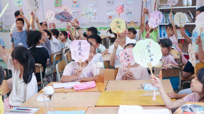 “扇面飄漆”環(huán)節(jié)進(jìn)一步提升了活動(dòng)的趣味性與參與度。孩子們輕壓扇面入水,觀察漆色花紋順著水流“爬”上扇面,形成各具特色的圖案:有的如晚霞漫染,呈現(xiàn)出“紫氣東來(lái)”的天然意境;有的似藍(lán)天白云,孩子們?cè)谄渖显鎏?ldquo;等風(fēng)來(lái)”的字樣,寄托對(duì)清涼的期盼;還有的被繪上“滿帆起航”的圖案,傳遞出勇敢無(wú)畏的精神。每一把扇子都成為孩子們內(nèi)心世界與千年技藝共鳴的見(jiàn)證,實(shí)現(xiàn)了童真與傳統(tǒng)的深度融合。
