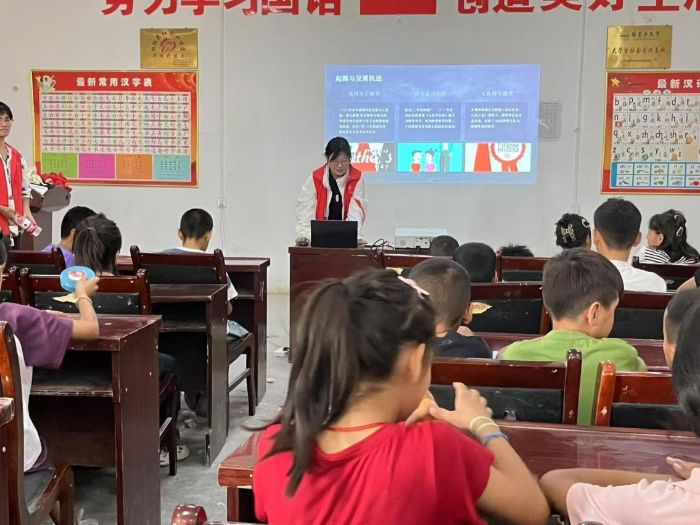 另一處場地里,實踐團隊成員正為孩子們帶來一堂生動的漢語課。墻面貼著“最新常用漢字表”,“日月年水”“大小上下”等基礎(chǔ)漢字清晰羅列,為孩子們的學(xué)習(xí)搭建了便捷的階梯。課堂上,志愿者們用猜字謎、情景演繹等趣味互動引導(dǎo)孩子們認讀,細細講解漢字背后的文化意涵。孩子們瞪著好奇的眼睛專注聽講,時不時高高舉起小手提問,清脆的童聲與溫和的講解交織,讓課堂充滿活躍融洽的氣息。