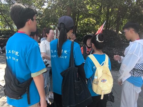 當(dāng)日上午,實(shí)踐隊(duì)抵達(dá)毛澤東銅像廣場(chǎng)。莊嚴(yán)肅穆的毛澤東銅像廣場(chǎng)前,實(shí)踐隊(duì)員整齊列隊(duì),肅目挺立,繞像瞻仰,每一個(gè)動(dòng)作都飽含著對(duì)偉人的無限崇敬與深切緬懷之情。隊(duì)員們?cè)谥v解員的引導(dǎo)下開展主題討論,分享對(duì)毛澤東同志波瀾壯闊革命生涯的深入洞察和對(duì)毛澤東思想的獨(dú)到感悟,將紅色精神與個(gè)人目標(biāo)相結(jié)合,立志在實(shí)踐中踐行偉人精神,傳承紅色基因。