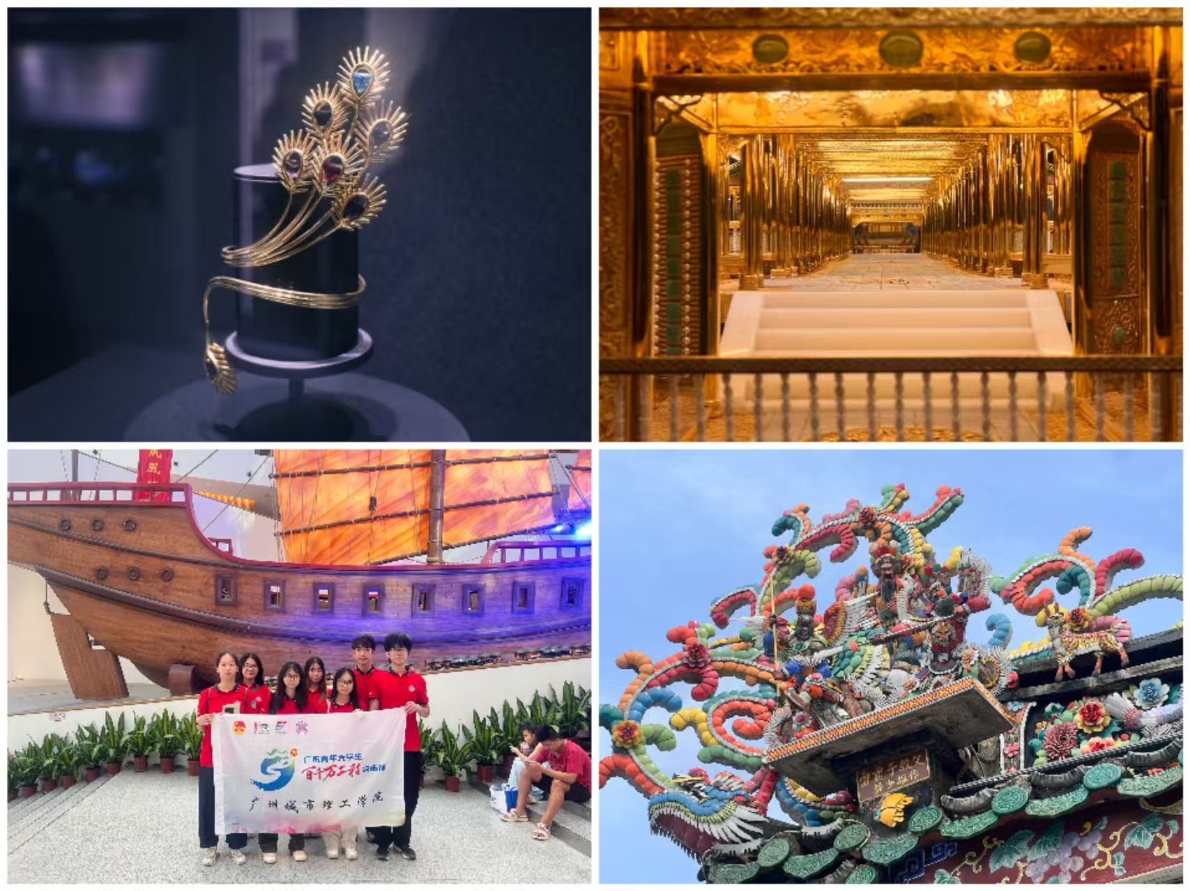 漫步于小公園街區(qū)時,實踐團仔細(xì)觀察了屋脊上精致的嵌瓷、木雕以及石雕柱礎(chǔ)。這些細(xì)節(jié)之處的工藝之美,生動展現(xiàn)了傳統(tǒng)工藝與歷史建筑的完美融合,深刻詮釋了“傳承不守舊,創(chuàng)新不離根”的文化發(fā)展哲學(xué)。午后,實踐團前往臻寶博物館,參觀了館內(nèi)琳瑯滿目的展品。從非物質(zhì)文化遺產(chǎn)工藝的精細(xì)展示到藝術(shù)藏品的獨特魅力,每一件展品都承載著深厚的文化底蘊。特別是那些融合了傳統(tǒng)美學(xué)的老銀飾和玉石鑲嵌作品,其精細(xì)的紋飾、材質(zhì)的巧妙搭配以及對吉祥寓意的精煉表達,給實踐團留下了深刻印象。這些珠寶設(shè)計中對文化符號的巧妙運用和對光澤質(zhì)感的精確把握,為實踐團提供了豐富的創(chuàng)作靈感,為即將進行的華文社區(qū)“華菁合唱團”胸針設(shè)計積累了寶貴的素材。在潮汕文化博覽中心,實踐團深刻體會到“文化自信是最為根本、深遠(yuǎn)、持久的力量”。最后,實踐團步入飛魚風(fēng)箏館,館內(nèi)各式靈動的風(fēng)箏承載著海洋文化記憶。圖文展板詳細(xì)介紹了竹篾扎架、糊紙彩繪的工藝,而“飛魚”造型則源自漁民的日常觀察,既保留了“年年有余”的傳統(tǒng)寓意,又通過現(xiàn)代設(shè)計讓風(fēng)箏更易升空,生動詮釋了“創(chuàng)新不離根”的智慧。