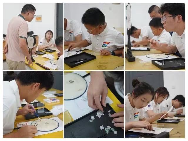 隨后,實踐團前往制作車間,近距離觀摩螺鈿漆扇全流程制作。匠人們專注于每道工序——切割、打磨、髹漆、鑲嵌,每一步都凝聚著技藝積淀與文化精神。作為揚州漆器代表性技法,螺鈿工藝以珍珠貝、云母等天然材料為原料,磨成薄片后按圖案精準切割,再鑲嵌入漆面,呈現(xiàn)出熠熠生輝的畫面。工作人員一邊操作一邊講解:“切割要穩(wěn),鑲嵌要準,哪怕一點偏差,整體美感就會失衡。”
