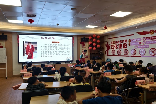 (圖為志愿者在給小朋友們介紹戰(zhàn)國袍)