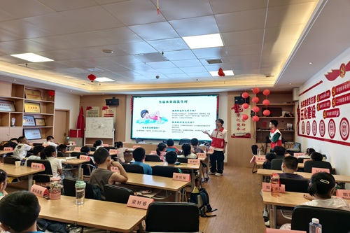 (圖為志愿者在給小朋友們介紹溺水事故的相關(guān)知識)