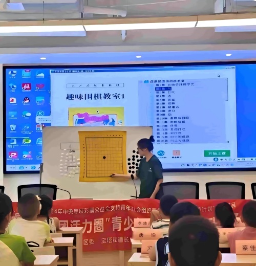 同步開展的圍棋課堂由服務(wù)隊智力拓展組專業(yè)主導(dǎo)。開班儀式上,志愿者以"堯造圍棋,教子丹朱"的典故開篇,闡釋圍棋"圍而相殺,爭得共存"的哲學(xué)智慧。實戰(zhàn)環(huán)節(jié)采用服務(wù)隊創(chuàng)新研發(fā)的"段位進階卡" :從"氣"的概念解析到"打吃"技巧演練,孩子們在十九路棋盤上運籌攻防。服務(wù)隊員俯身對弈臺旁,以"一棋一解"的互動教學(xué),讓抽象棋理化為具象思維訓(xùn)練。